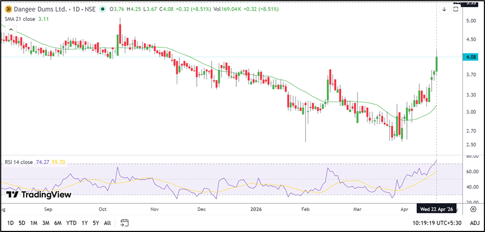 Dangee Dums Ltd (NSE: DANGEE) has seen a strong rebound after weeks of sideways trading. The move above the 21-day SMA and the breakout beyond ₹4.00 have improved the near-term outlook.