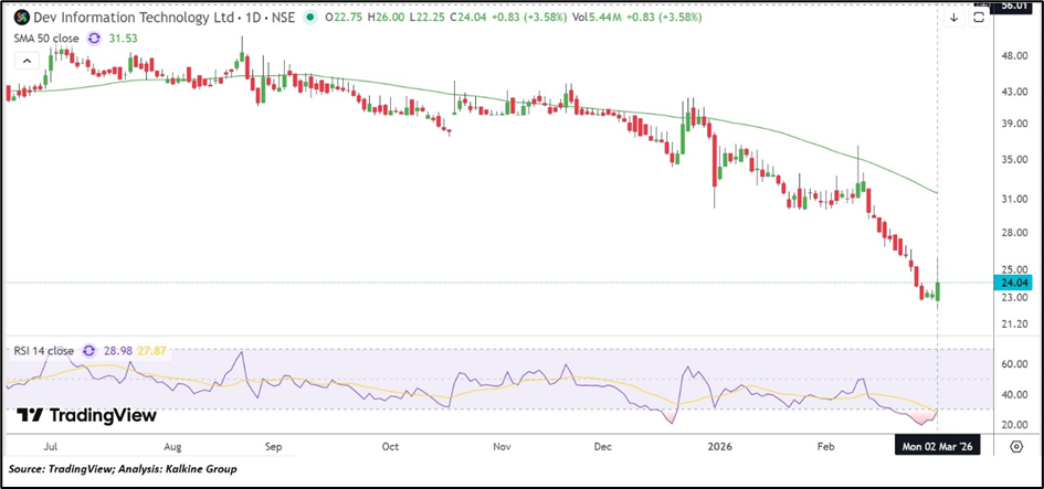 Dev Information Technology Limited (NSE:DEVIT) closed at ₹23.56, remaining below its 50-day Simple Moving Average at ₹31.53, which continues to reflect a subdued broader structure. The 14-day RSI at 28.98 indicates oversold conditions, suggesting the possibility of short-term consolidation. Immediate support is positioned in the ₹22–₹20 zone, while resistance is seen between ₹28–₹30. Movement within this range may shape the near-term price trajectory as the stock attempts to stabilise.