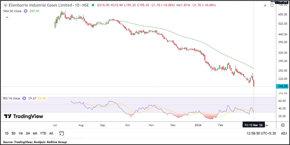 Ellenbarrie Industrial Gases Limited declined sharply, trading around INR 195.35 with a drop of about 10.00% on March 13, 2026, reflecting continued weakness on the daily chart. The stock remains well below its 50-day Simple Moving Average near INR 257.41, indicating a sustained downward trend. The 14-day RSI near 29.67 suggests the stock is approaching oversold territory after the recent decline. The movement may be linked to sectoral volatility in industrial stocks, profit booking following earlier gains, and changes in market liquidity affecting mid-cap companies. In the near term, support is placed around INR 170.00–INR 150.00, while resistance is seen near INR 220.00–INR 240.00.