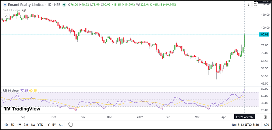 Emami Realty’s sharp rally signals a strong technical breakout after a prolonged weak phase. The move reflects improving short-term structure, but sustainability remains the key factor.