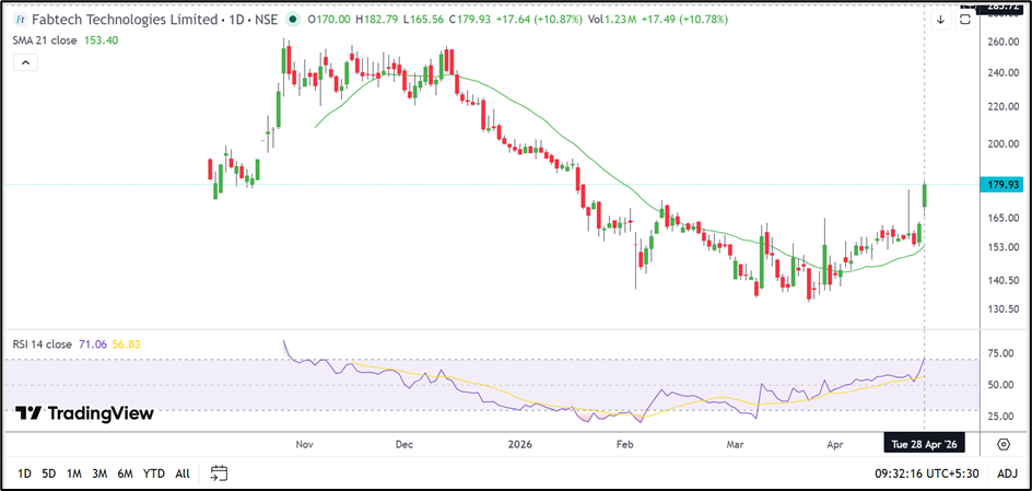 Technically, Fabtech Technologies Limited is trading near ₹178.30 and has moved above its 21-day SMA around ₹153.40, indicating a strengthening short-term structure.