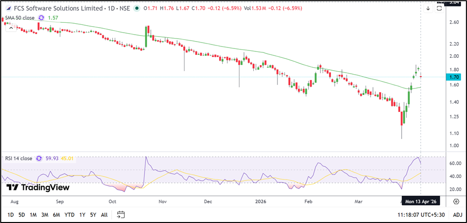 FCS Software Solutions had been moving steadily higher after rebounding from its April low, but the stock appears to be pausing after a nearly vertical rise. The latest candle shows that the stock failed to hold near the ₹1.80 region and closed lower despite trading above its 50-day Simple Moving Average near ₹1.57.