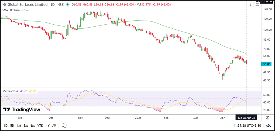 Technically, Global Surfaces Limited is trading near ₹56.83 and remains below its 50-day SMA around ₹67.28, indicating a weak structure.