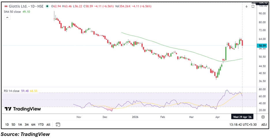 Technically, GLOTTIS is trading above its 50-day SMA near ₹49.10, indicating that the broader short-term structure remains intact despite the recent fall. The price action shows a recovery followed by a sharp rejection near higher levels, suggesting a pause in momentum.