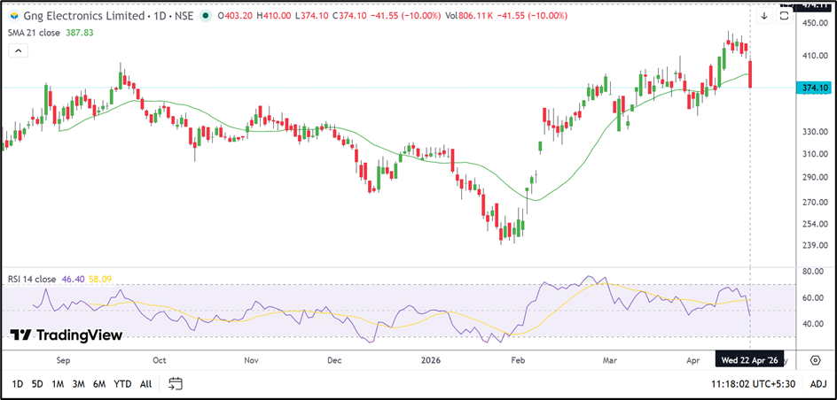 GNG Electronics Ltd (NSE: GNG) has come under pressure after failing to sustain near recent highs. The stock is now trading below its 21-day SMA and appears to be facing resistance near the recent peak zone.