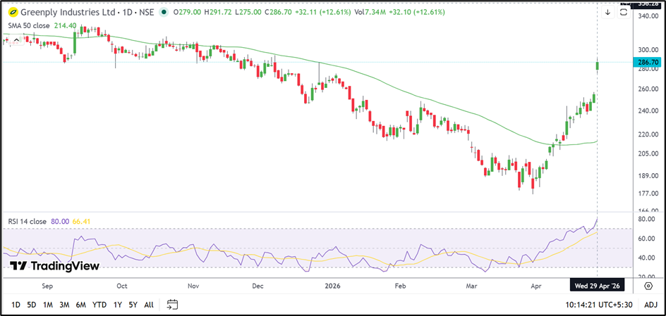 Technically, Greenply Industries is trading well above its 50-day SMA near ₹214.40, indicating a strong improvement in the near-term structure. Price action shows a sharp breakout from a recovery range, suggesting a transition from consolidation to momentum-driven expansion.