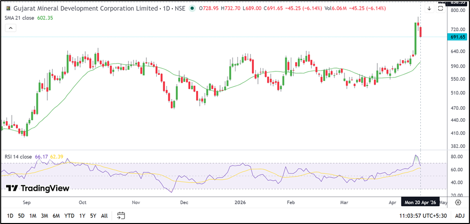 The decline comes after a powerful rally over the past few weeks, during which GMDC moved from below ₹550.00 to above ₹730.00. The latest correction suggests that the stock is witnessing profit booking after a rapid rise.
