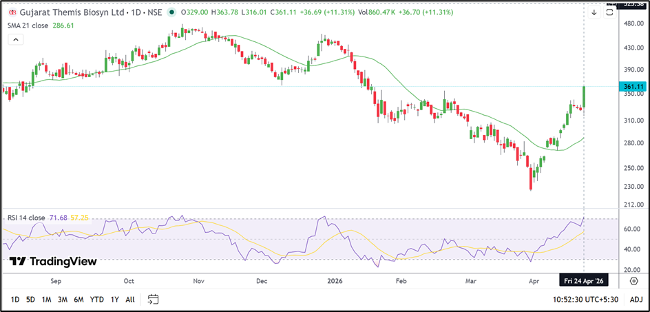 Gujarat Themis Biosyn has delivered a strong recovery, supported by stable earnings and improving technical structure. However, with RSI in overbought territory and resistance approaching, the stock may enter a consolidation phase before the next directional move.