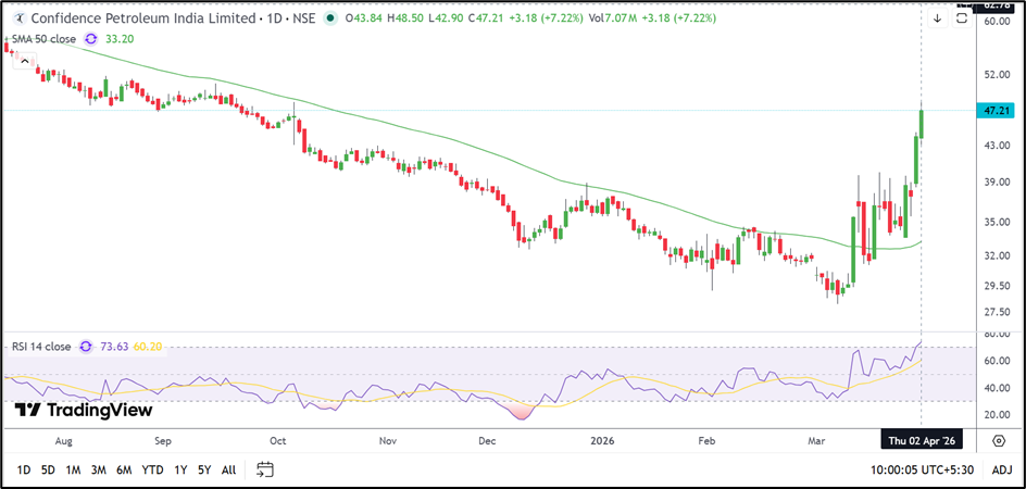 Confidence Petroleum India (NSE: CONFIPET) is currently trading near INR 47.21 and remains well above its 50-day Simple Moving Average near INR 33.20. The stock had spent several months in a declining phase before beginning a gradual recovery in March.