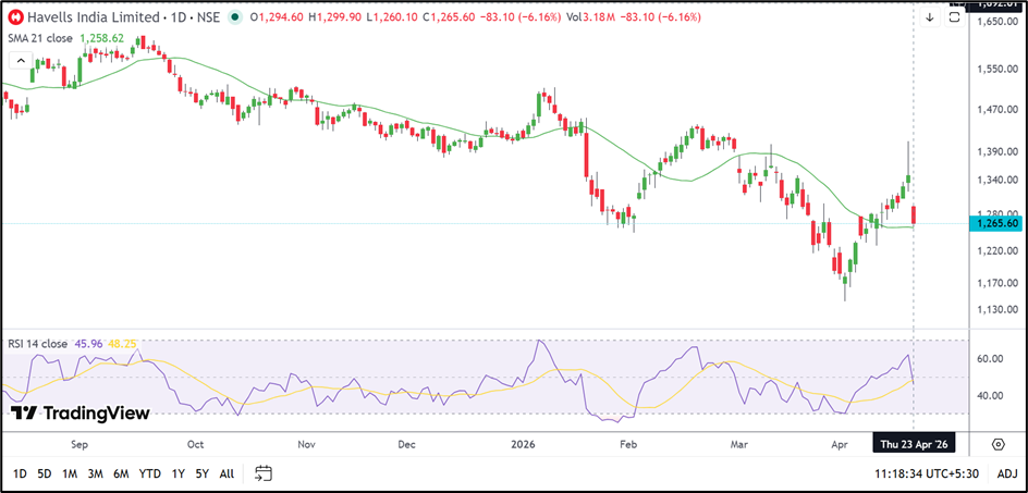 Havells India is currently trading near ₹1,265.60 and has drifted back toward its 21-day SMA placed around ₹1,258.62. The stock formed a large bearish candle after failing to hold higher levels, indicating rejection at the upper band.