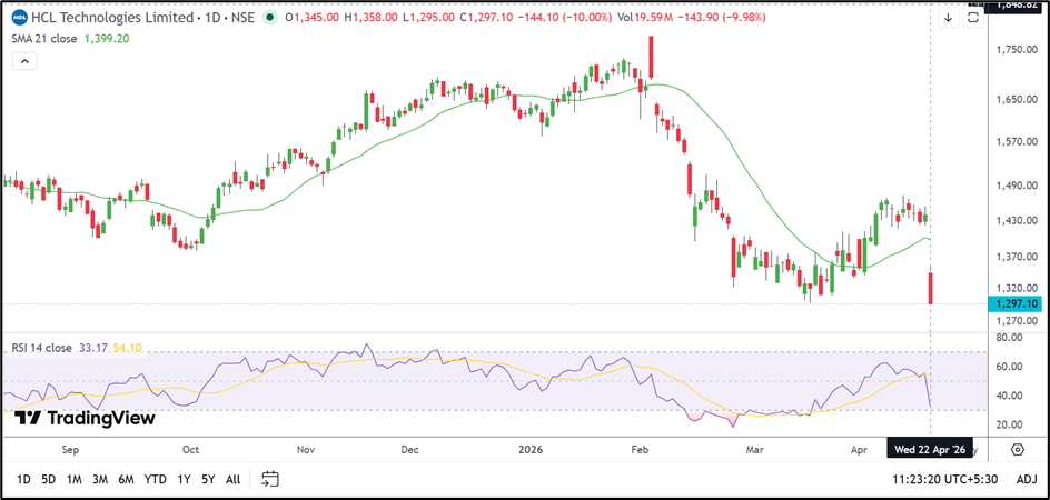 HCL Technologies Ltd (NSE: HCLTECH) has come under heavy pressure after a sharp post-result decline. The stock is now trading below its 21-day SMA and appears to be facing resistance near the recent breakdown zone.