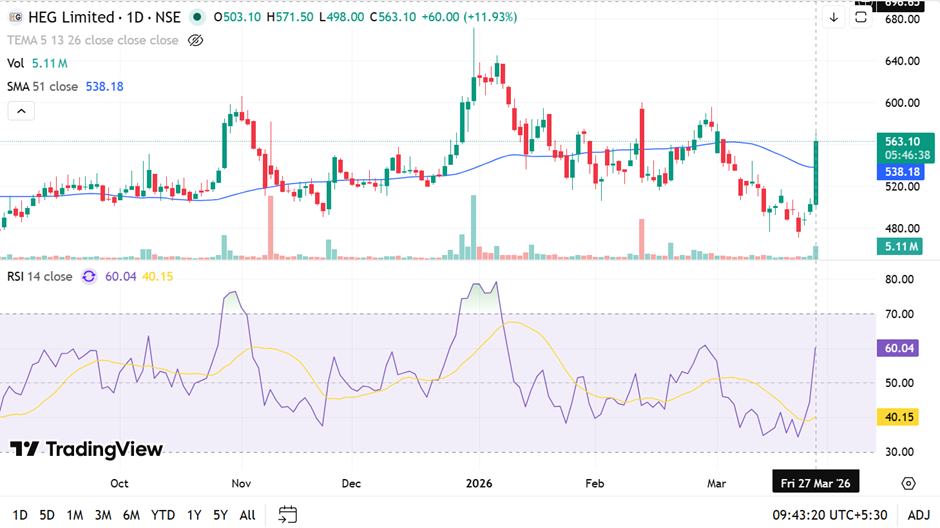 Shares of HEG (NSE:HEG) is trading at ₹563.10 on March 27, 2026, rising ₹60.00 or 11.93% on the National Stock Exchange of India. The session recorded a sharp spike in trading volumes, significantly above recent levels.