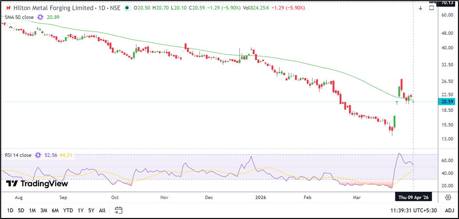 Hilton Metal Forging Limited (NSE: HILTON) is also trading slightly below its 50-day Simple Moving Average near ₹20.89. The inability to remain above the moving average suggests that the broader trend continues to stay weak despite the recent recovery attempt.
