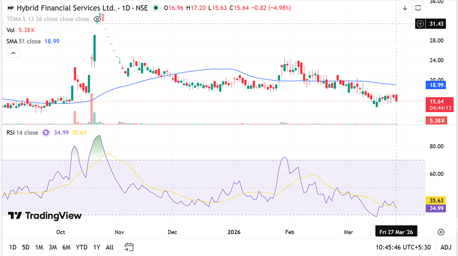 Shares of Hybrid Financial Services (NSE:HYBRIDFIN) were trading at ₹15.64 on March 27, 2026, registering a decline of 4.98% on the National Stock Exchange of India. The stock has been in a sustained downtrend since peaking near ₹30.00 in late 2025.