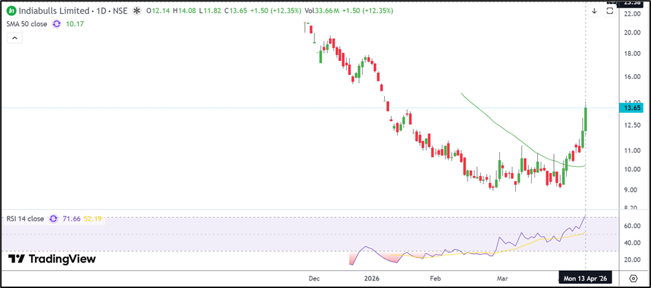 Indiabulls Limited (NSE: INDIABULLS) rose 12.35% to ₹13.65 on April 13, 2026, after opening at ₹12.14 and touching an intraday high of ₹14.08. The stock remained among the top gainers of the session after continuing the strong move seen over the past week.