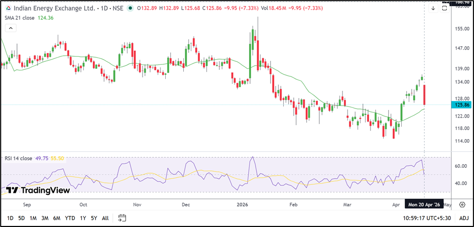IEX is still trading marginally above its 21-day SMA of ₹124.36, but the latest candle has weakened the short-term setup. The stock briefly moved above ₹135.00 in recent sessions before reversing sharply, which often reflects exhaustion after a fast rebound.