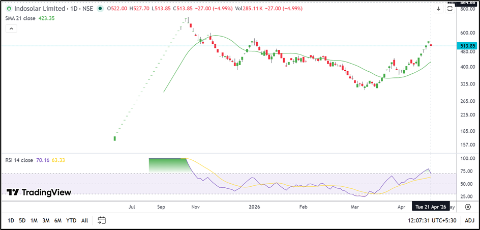 The decline comes after a powerful rally that lifted the stock from the ₹300.00 zone in March to above ₹540.00 in April. Even after the latest weakness, Indosolar remains one of the stronger-performing names in the broader market.