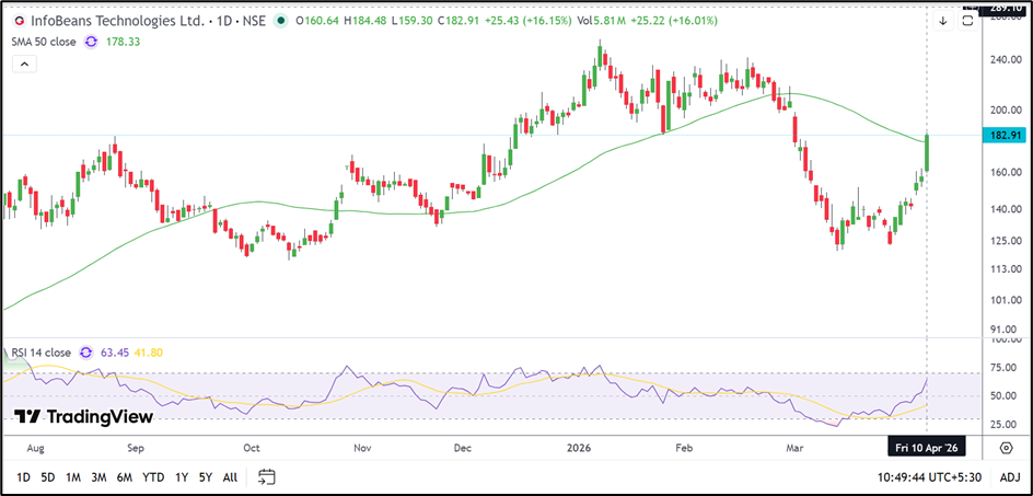 InfoBeans Technologies Limited (NSE: INFOBEAN) has strengthened significantly after rising more than 16.00% and moving back above its 50-day SMA. The chart structure has improved, while momentum indicators also suggest that the recovery remains active. Traders may now watch whether the stock can hold above ₹173.00 and continue its move toward the next higher zone.