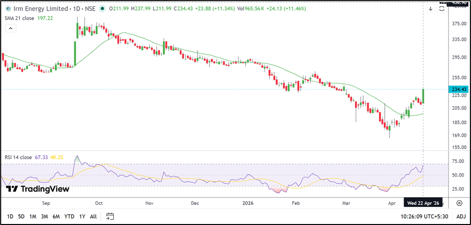 The latest rally has pushed IRM Energy to its highest level in more than six weeks. The move also marks a clear breakout from the recent trading band near ₹205.00–220.00.