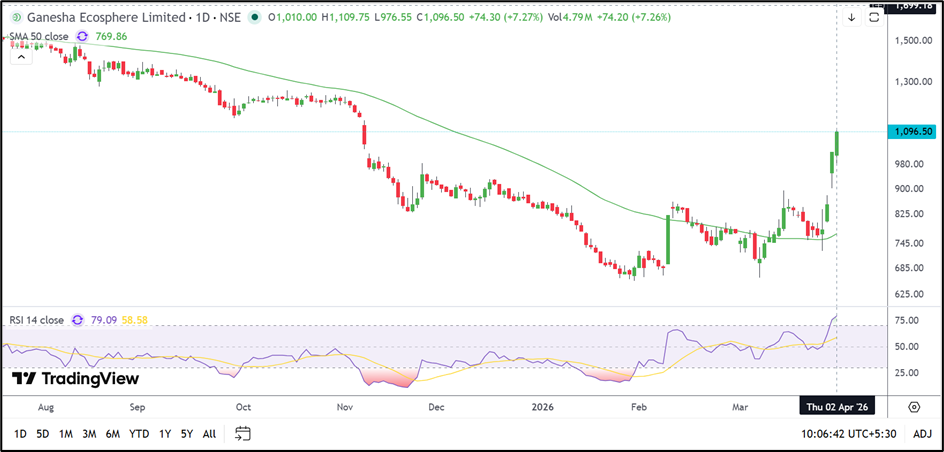 Ganesha Ecosphere (NSE: GANECOS) rose 7.26% to INR 1,096.50 after extending its recent rally above INR 1,000.00. The stock now trades above its 50-day moving average near INR 769.86, while RSI near 79.09 indicates overbought conditions. Investors are likely to watch whether the stock can remain above INR 1,000.00.