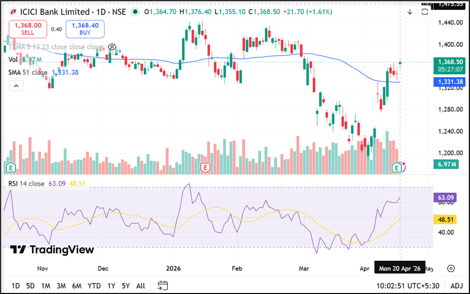 ICICI Bank Limited (NSE:ICICIBANK) is trading near ₹1,368.50, up around 1.61%, as on 20 April 2026 and has recently reclaimed a position above the 51-day SMA near ₹1,331.38, with The 14-day RSI near 63.09 and immediate support is placed in the ₹1,330.00–1,280.00 zone, while resistance is seen near the ₹1,400.00–1,440.00 range.