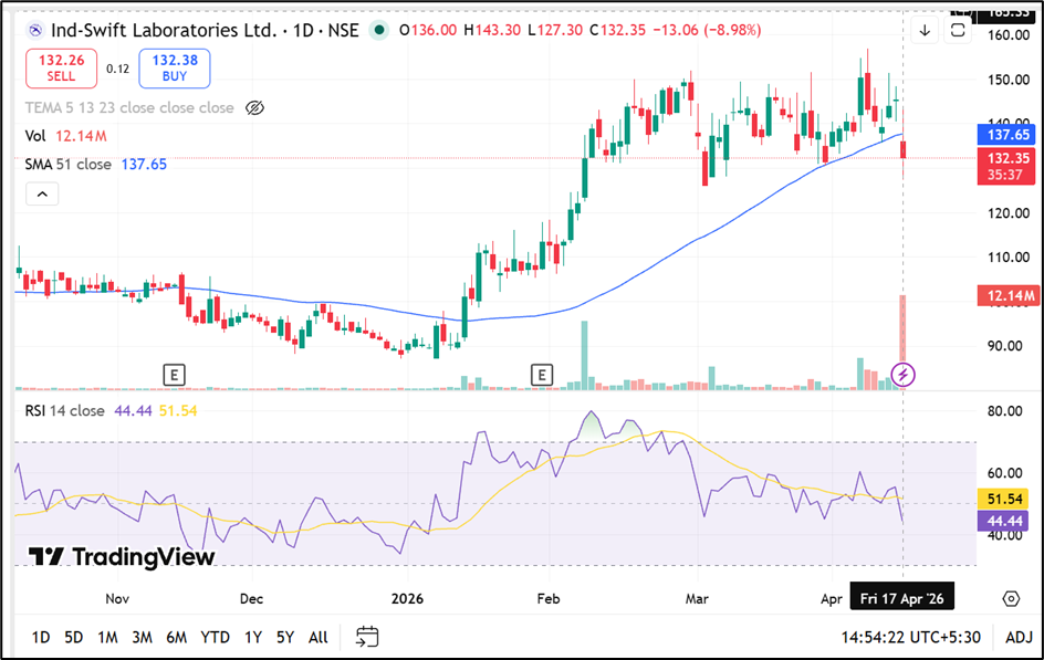 Ind-Swift Laboratories (NSE:INDSWFTLAB) is trading near INR 132.35, reflecting a decline of around 8.98% in the latest session. The stock has slipped below its 50-day simple moving average at INR 137.65, indicating that the broader structure is weakening after a prior uptrend.