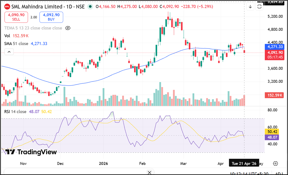 SML Isuzu Limited (NSE:SMLMAH) is trading near ₹4,092.90, down around 5.29%, and continues to remain below the 51-day SMA near ₹4,271.33, while the 14-day RSI near 48.07 points. Immediate support is placed in the ₹3,800.00–3,600.00 zone, while resistance is seen near the ₹4,400.00–4,800.00 range.
