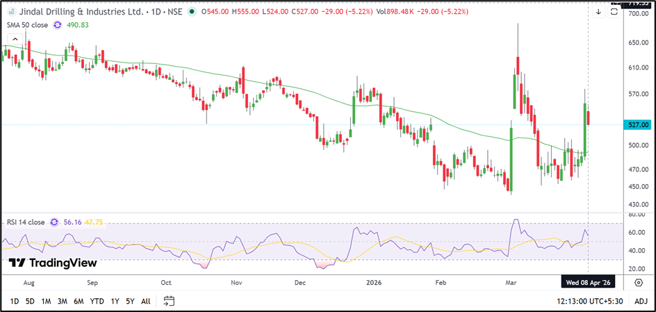 Jindal Drilling (NSE: JINDRILL) is currently trading near ₹527.00, down 5.22% in the session. Even after the decline, the stock remains above its 50-day Simple Moving Average near ₹490.83, suggesting that the broader trend has not yet completely weakened.