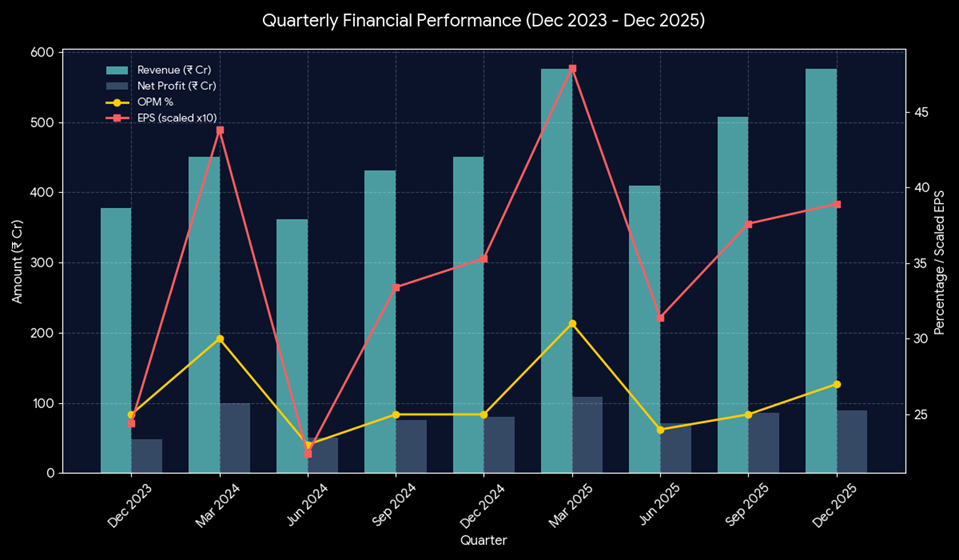 The quarterly trajectory demonstrates consistent revenue growth (Dec 2025 revenue of ₹576 Cr matches the record Mar 2025 quarter) and margin stability in the 24–31% range. The pattern of stronger March quarters (year-end) is typical for capital goods companies with government and defence customers who front-load procurement decisions toward fiscal year-end. The Dec 2025 quarter's ₹576 Cr revenue matching the prior peak is an encouraging sign that the growth trend is continuing.