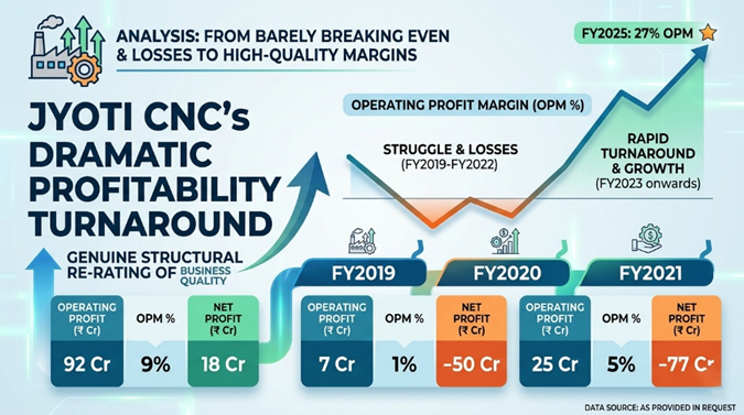 The most analytically compelling aspect of Jyoti CNC's recent history is the dramatic improvement in operating profitability. The company went from barely breaking even in FY2019 (OPM of 9%) and suffering losses through FY2022, to delivering an operating profit margin of 27% in FY2025 — a genuine structural re-rating of the business quality.