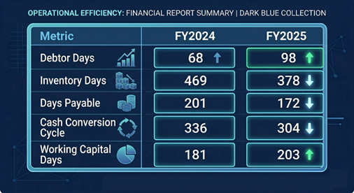 Working capital days have increased from 112 days (earlier period) to 203 days in FY2025 — a substantial deterioration. Debtor days have risen from 74 to 98 days, indicating slower collections from customers. While inventory days have improved from 469 to 378 days (reflecting better operational efficiency), the net working capital position has worsened considerably.
