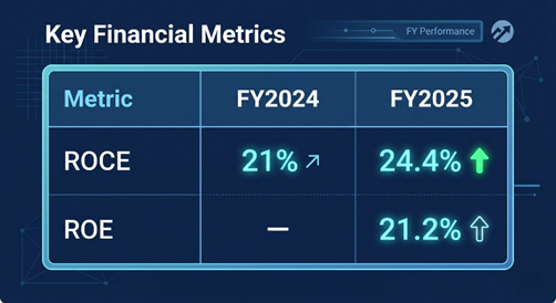 Both ROCE and ROE have improved substantially and now sit at levels that indicate efficient capital deployment. A ROCE of 24.4% — substantially above the cost of capital — is the hallmark of a business with genuine competitive advantages and pricing power. The trend direction (improving) is as important as the absolute level.