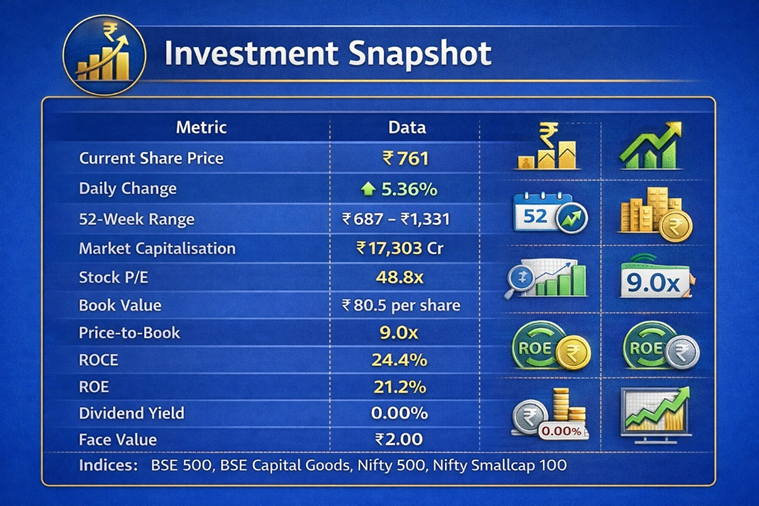 The 1-year stock price CAGR of -33% — from a 52-week high of ₹1,331 to the current ₹761 — suggests the stock corrected from an arguably overvalued position reached in 2025 and is now trading at a more moderate multiple. The current price represents a meaningful discount to peak valuation, which may offer an improved entry point for investors with a 3–5 year horizon.