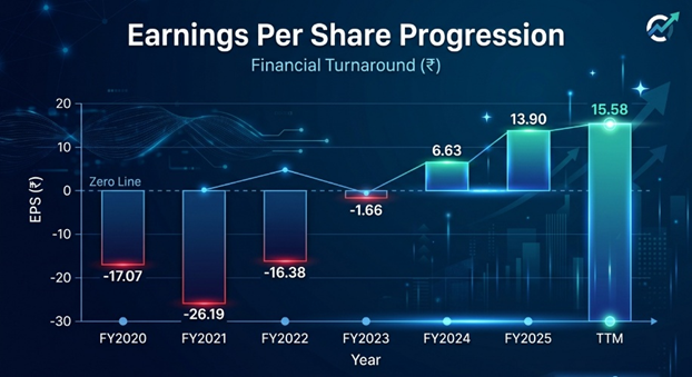 The EPS trajectory from deeply negative through FY2021 to ₹15.58 TTM is a textbook earnings recovery story. The 5-year net profit CAGR of 42.8% (which includes the loss years in the base) reflects the magnitude of the turnaround. The 3-year profit CAGR of 105% is even more striking, capturing the acceleration phase of the recovery.