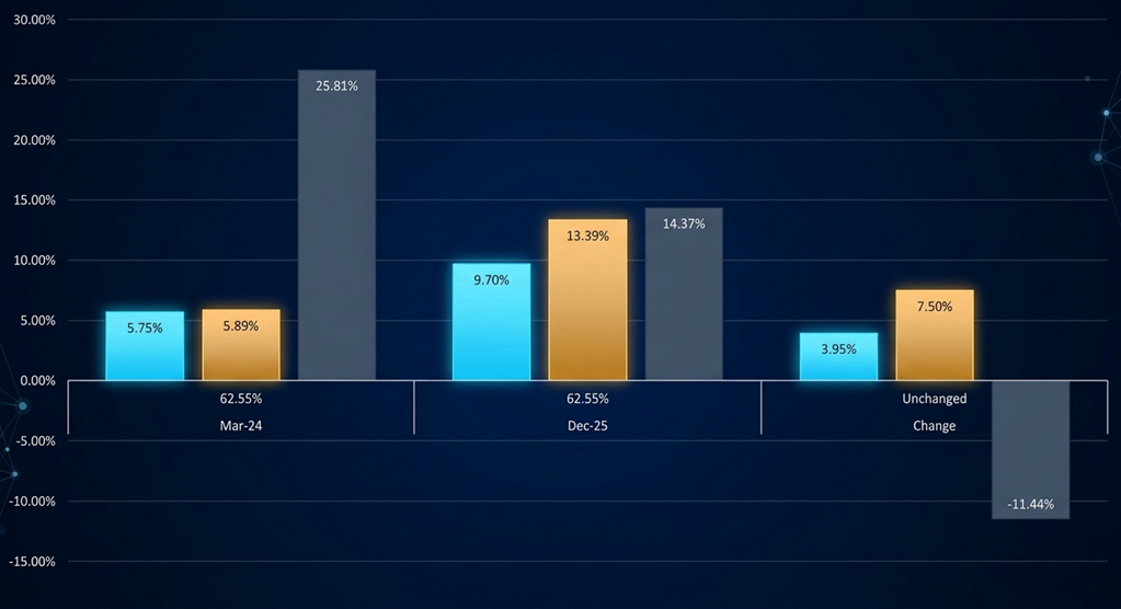 The shareholding trend over the past four quarters is one of the most constructive signals in the entire Jyoti CNC investment case. Institutional investors — both foreign (FIIs) and domestic (DIIs) — have collectively increased their stake from 11.64% in March 2024 to 23.09% by December 2025, an increase of nearly 12 percentage points. This accumulation has come almost entirely at the expense of retail public shareholders, whose holding has declined from 25.81% to 14.37%.