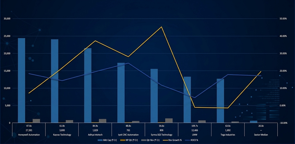 Scale Gap: Jyoti's quarterly revenue of ₹576 Cr is smaller than Honeywell's ₹1,169 Cr and Syrma's ₹1,264 Cr, but the growth trajectory suggests this gap is narrowing. The company is at an earlier stage of its revenue compounding curve than its larger peers.