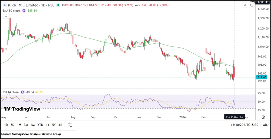 K.P.R. Mill Limited declined sharply, trading around INR 819.40 with a drop of about 9.90% on March 13, 2026, reflecting weakness in recent price action on the daily chart. The stock is currently below its 50-day Simple Moving Average near INR 889.34, indicating that the short-term trend remains under pressure. The 14-day RSI near 40.84 suggests moderating momentum following the recent decline. The movement may be associated with concerns over global textile demand, profit booking after earlier rallies, and changing market sentiment toward export-oriented companies amid currency and global economic trends. In the near term, support is placed around INR 760.00–INR 700.00, while resistance is seen near INR 870.00–INR 950.00.
