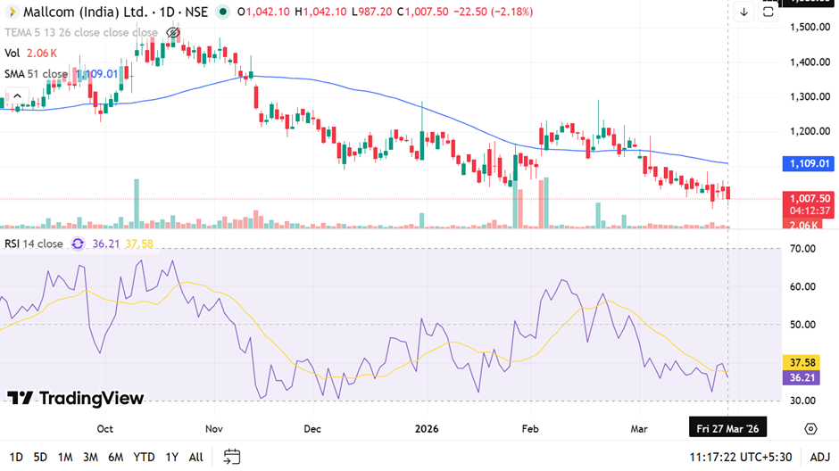 Mallcom (India) stock declined over 2% and remains in a sustained downtrend. The price is trading well below its 51-period SMA, which continues to act as resistance. RSI indicates weak momentum, while low volume reflects limited participation. The ₹1,000 level remains a key support zone, and its behavior will likely determine near-term direction.