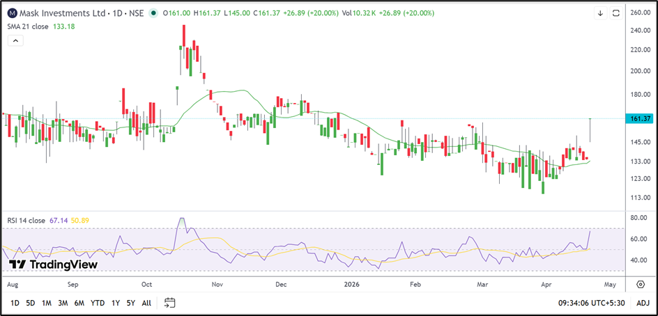 Mask Investments (NSE: MASKINVEST) rallied sharply on April 23, hitting the upper circuit at ₹161.37. The stock opened at ₹161 and sustained buying momentum through the session after a strong gap-up.
