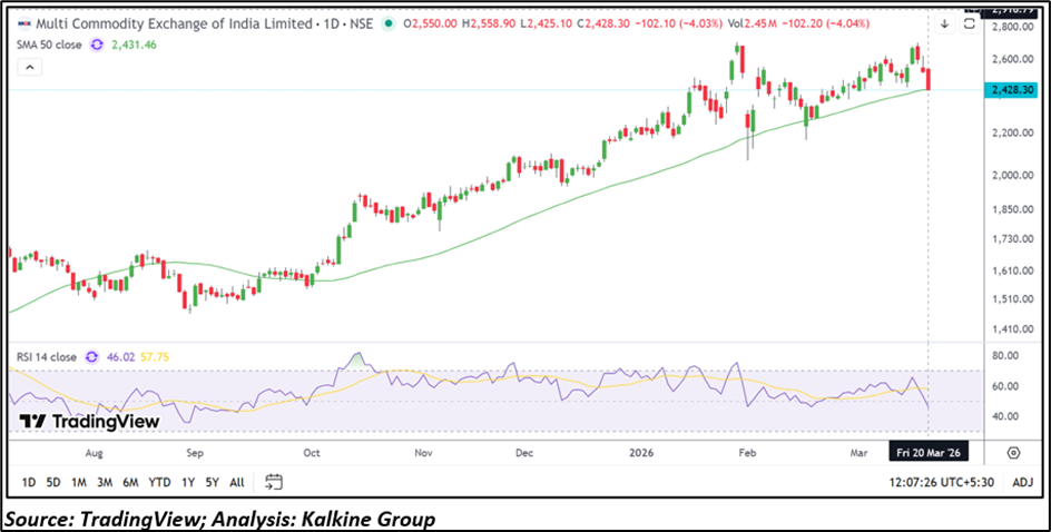 MCX shares declined 4.03% to ₹ 2,428.30, trading near the 50-day SMA at ₹ 2,431.46, which acts as key support. The stock shows a pause after a sustained uptrend with RSI at 46.02, indicating weakening momentum. Support is placed near ₹ 2,200 and ₹ 2,000, while resistance levels are seen around ₹ 2,650 and ₹ 2,850.