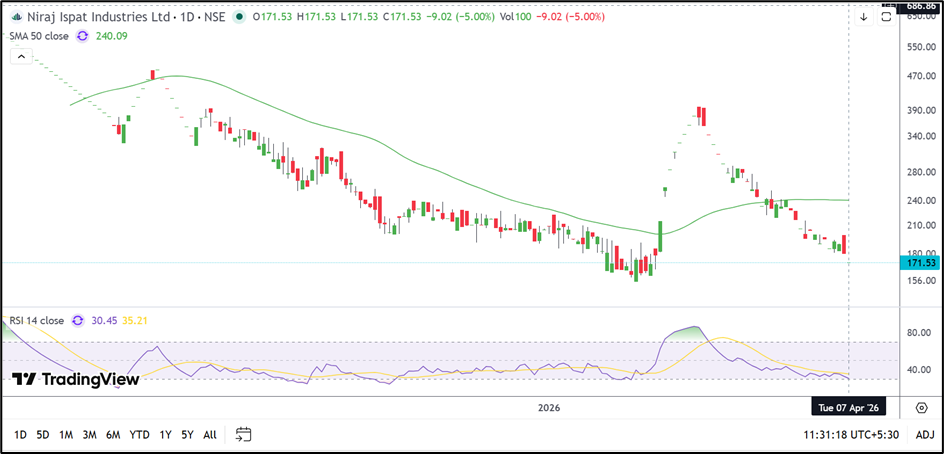 Niraj Ispat Industries (NSE: NIRAJISPAT) is currently trading near INR 171.53 and remains far below its 50-day Simple Moving Average of INR 240.09. The chart shows that the stock has continued to make lower highs and lower lows after failing to hold above the INR 200.00 zone.