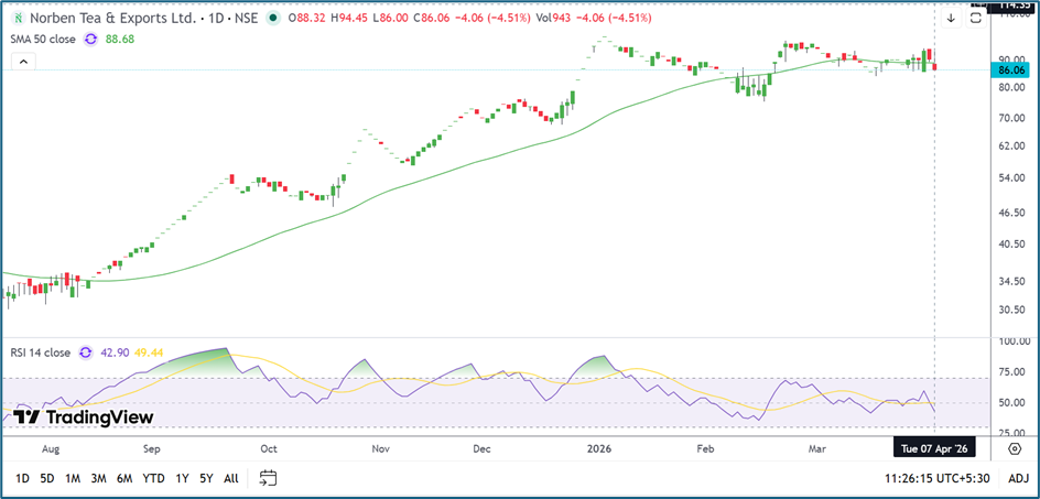 Norben Tea & Exports (NSE: NORBTEAEXP) is currently trading near INR 86.06 and has slipped below its 50-day Simple Moving Average of INR 88.68. The latest chart pattern suggests that the stock is facing resistance near the INR 92.00–100.00 region.