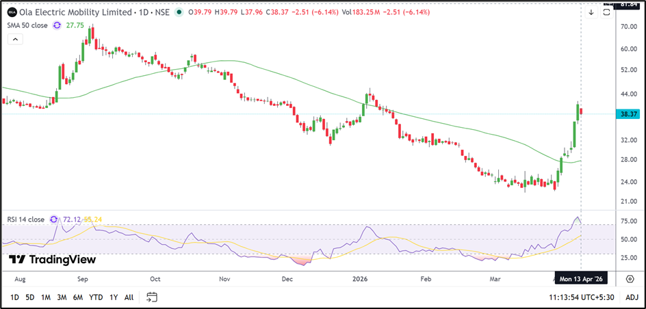 Ola Electric Mobility has witnessed a strong rebound from its March lows, but the latest session suggests that the rally may be slowing near a key overhead zone. The stock remains above its 50-day SMA, although persistent losses and an overheated RSI indicate that volatility could remain elevated.