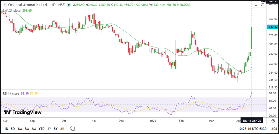 Oriental Aromatics Limited (NSE: OAL) jumped 20.00% to ₹340.32 on April 16, 2026, after opening at ₹289.90. The stock touched a low of ₹289.35 before witnessing aggressive upside momentum through the session and eventually locking at the day’s high.