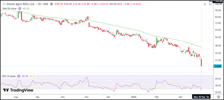 Oswal Agro Mills shares fell 14.61% to INR 33.89 after slipping below key support. The stock remains below its 50-day moving average near INR 47.15, while RSI has dropped to 25.74. Support is placed near INR 30.00–28.00, while resistance is seen around INR 38.00–42.00.