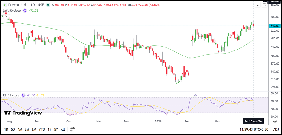 Precot Limited is currently trading near ₹547.00 and remains above its 50-day Simple Moving Average of ₹472.78. This suggests that the broader trend continues to remain constructive despite the latest decline.