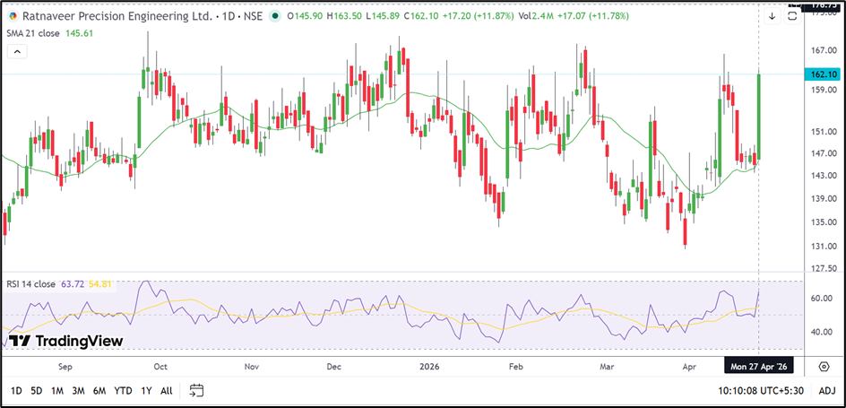 Ratnaveer Precision Engineering Limited (NSE: RATNAVEER) moved sharply higher to ₹162.21, gaining 11.95%, as the stock witnessed a sudden surge in momentum. The move comes after a period of sideways consolidation, with price now pushing toward higher levels.