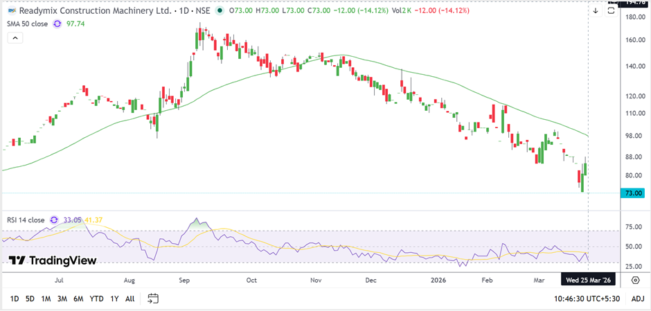Readymix Construction Machinery Ltd (NSE:READYMIX) traded near INR 73.00 on March 25, 2026, declining around 14.12% during the session. The stock remains well below its 50-day Simple Moving Average near INR 97.74, indicating a weak broader technical structure.