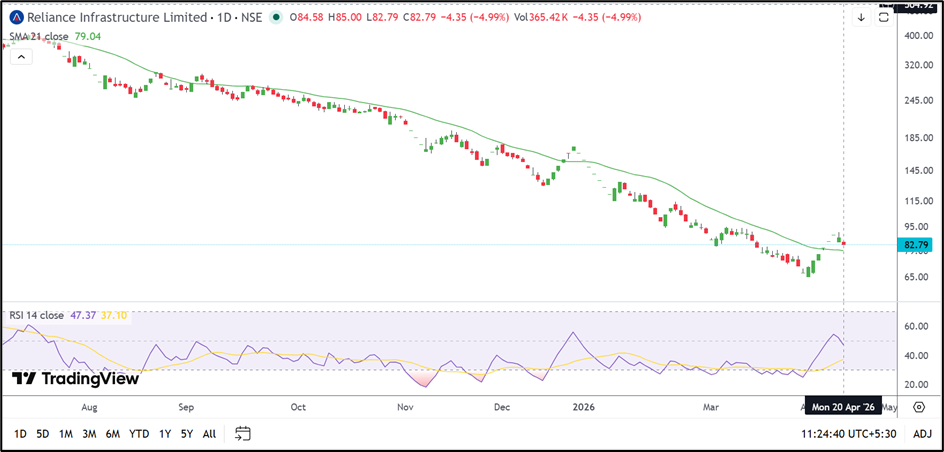 Reliance Infrastructure Ltd (NSE: RELINFRA) remains under pressure after another sharp decline and weak quarterly performance. While the stock is still holding above its 21-day SMA, the latest rejection near ₹85.00 suggests that the recent rebound may already be running out of steam.