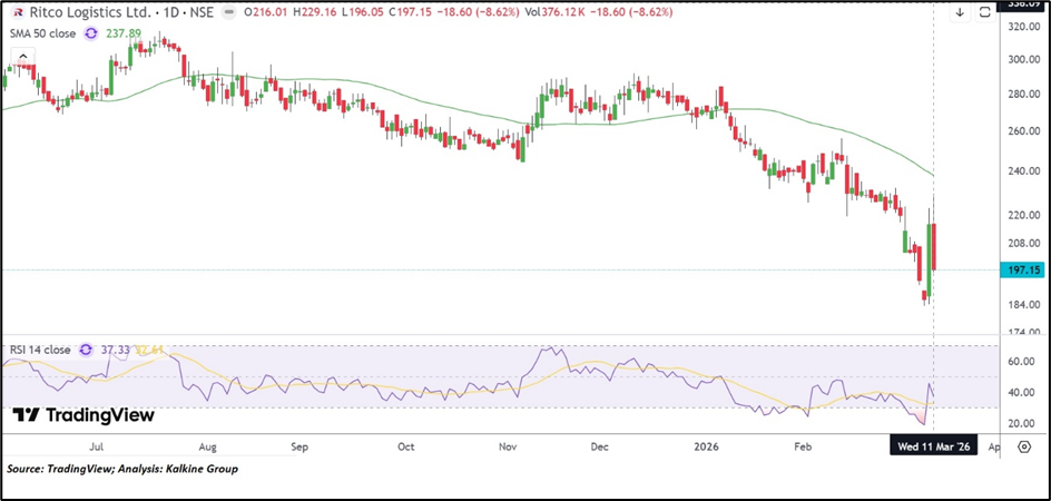 Ritco Logistics Ltd. is trading around ₹197.15 on March 11, 2026, down 8.62% during the session. The stock remains below its 50-day moving average near ₹237.89, indicating softer short-term price momentum. The RSI around 37.33 suggests moderate momentum conditions. Overall, the stock’s price movement indicates a weak trend in the near term.